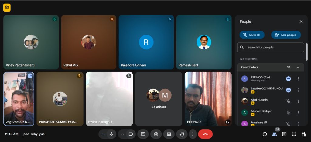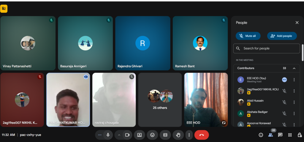 The Department of Electrical and Electronics Engineering successfully organized an Alumni Meet on 21st December 2025, conducted in virtual mode. The event provided a valuable platform for alumni to reconnect with their alma mater, interact with faculty members, and share their professional experiences with current students. The alumni shared insights on career opportunities, higher education, industry trends, and the importance of skill development in the field of Electrical and Electronics Engineering. The virtual alumni meet strengthened the bond between the department and its alumni, fostering collaboration, mentorship, and continued engagement for the growth and development of the department.